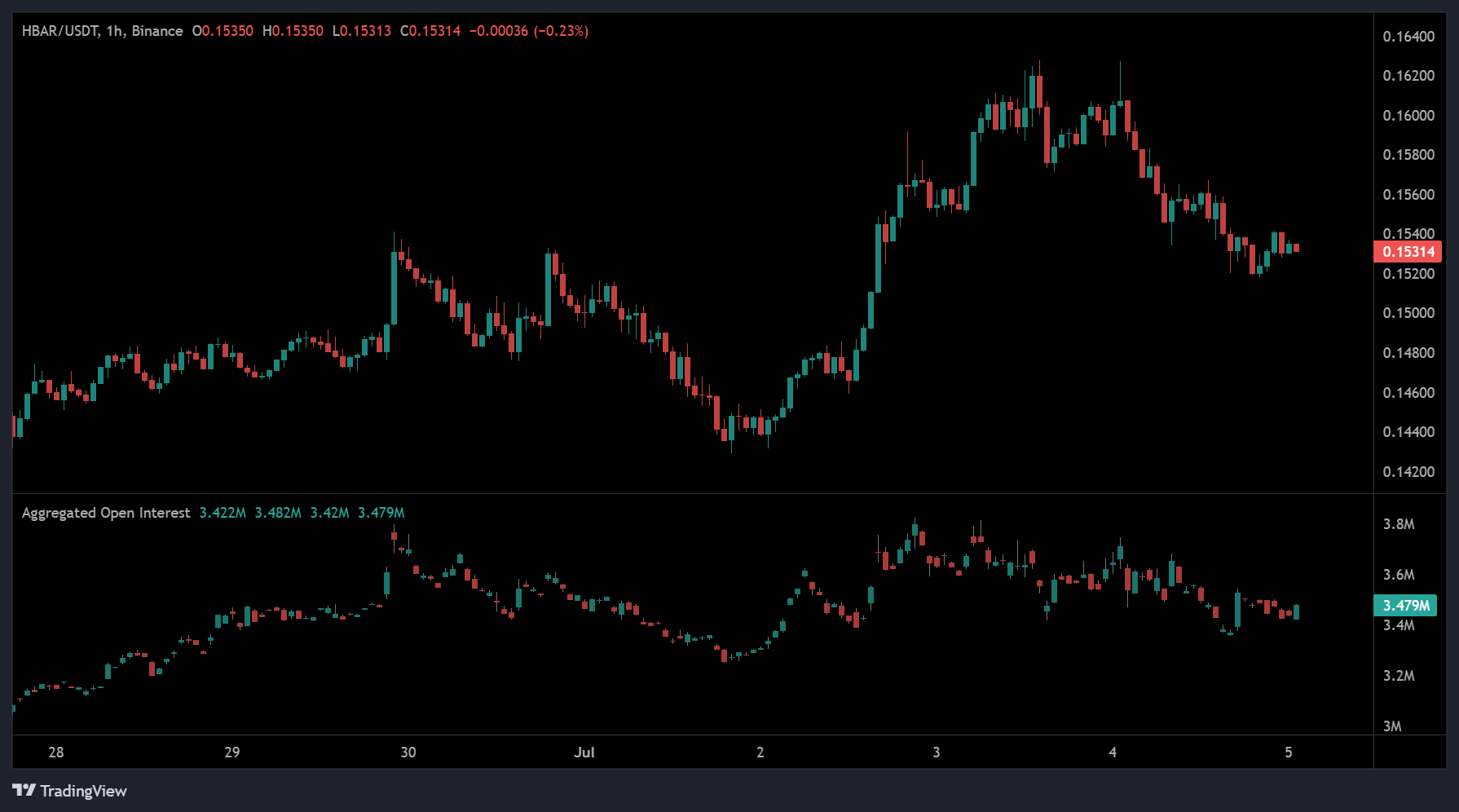 On the 1-hour HBAR/USDT chart from Open Interest, price fluctuations have been confined within a narrow range between $0.153 and $0.162 since the post-June rally. A sharp move above $0.162 on June 30 was quickly reversed, triggering a consolidation pattern that has since remained intact.