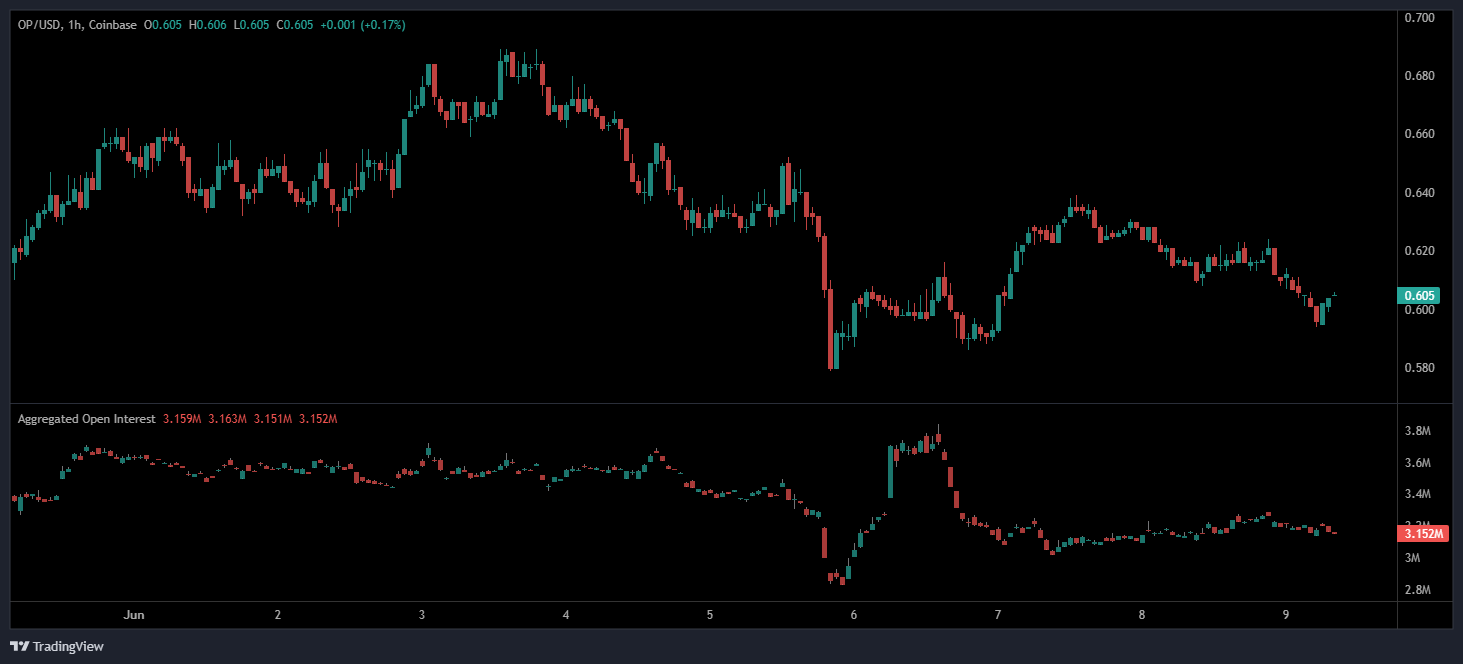 On the hourly chart, OP/USD has demonstrated heightened volatility throughout early June. A sharp rally to approximately $0.67 on June 3 was quickly followed by an accelerated decline, culminating in a breakdown below $0.62 on June 5. This move was accompanied by a noticeable surge in aggregated open interest, indicating an increase in speculative trading activity, likely from short positions or forced liquidations.