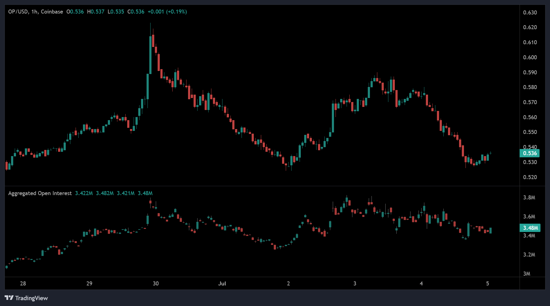 The token has struggled to regain its footing above key resistance zones, with sellers firmly in control over the past few sessions. As of July 5, 2025, OP is trading near $0.535 after a sharp multi-day