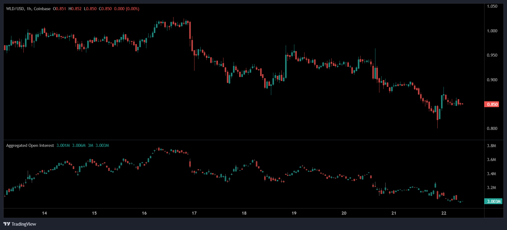 Worldcoin (WLD) is showing signs of persistent bearish momentum as it struggles to hold above the $0.85 level. Price action across the 1-hour, 24-hour, and daily charts indicates a consistent pattern of lower highs and lower lows, with little indication of a confirmed reversal.